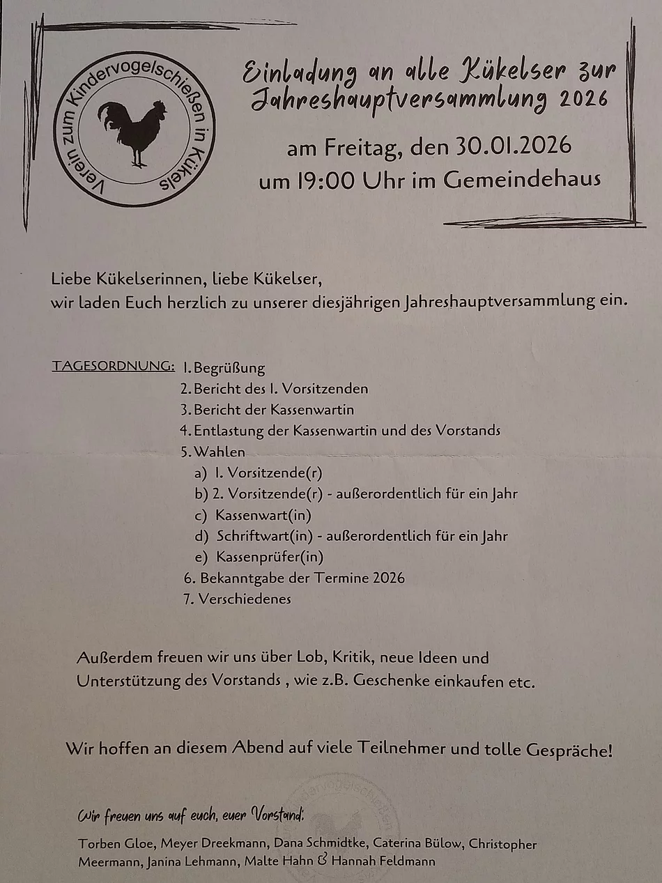 Der Verein zum Kindervogelschießen in Kükels lädt alle herzlich zur diesjährigen Jahreshauptversammlung ein.