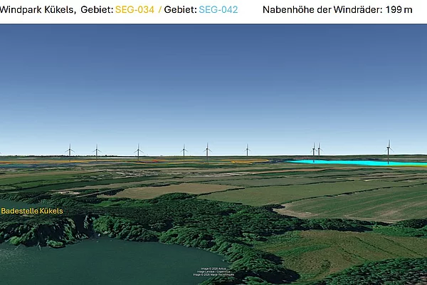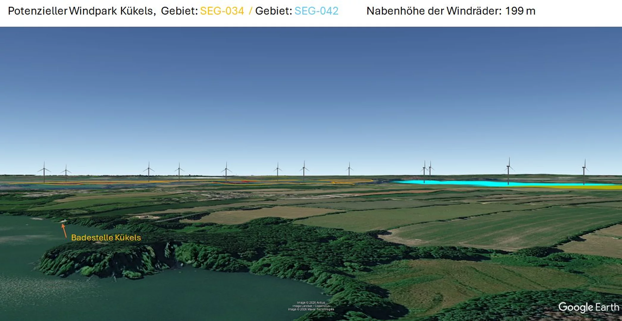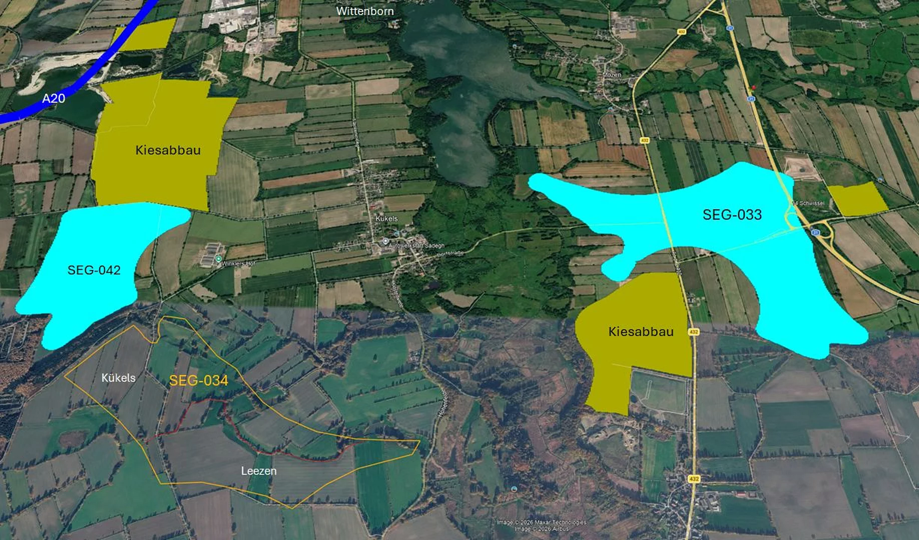 - Aktuell ist die Fläche SEG-033 mit 5 Windräder bebaut. Das letzte Windrad wurde im Aug./Sep. 2025 errichtet, dennoch wird diese Fläche schon wieder überplant. Die Fläche soll vergrößert und mit weiteren Windrädern erweitert werden. Hier hat Gemeindevertretung Kükels keinen Einfluss auf die Geschehnisse.