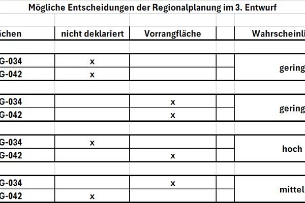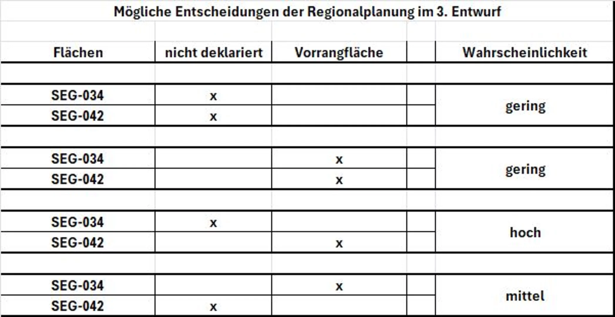 Aktuell läuft die Auswertung des 3. Entwurfs. Die Entscheidung, vermutlich im Mai 2026, der Regionalplanung könnte wie folgt aussehen: (siehe Bild “Mögliche Entscheidungen der Regionalplanung im 3. Entwurf”)